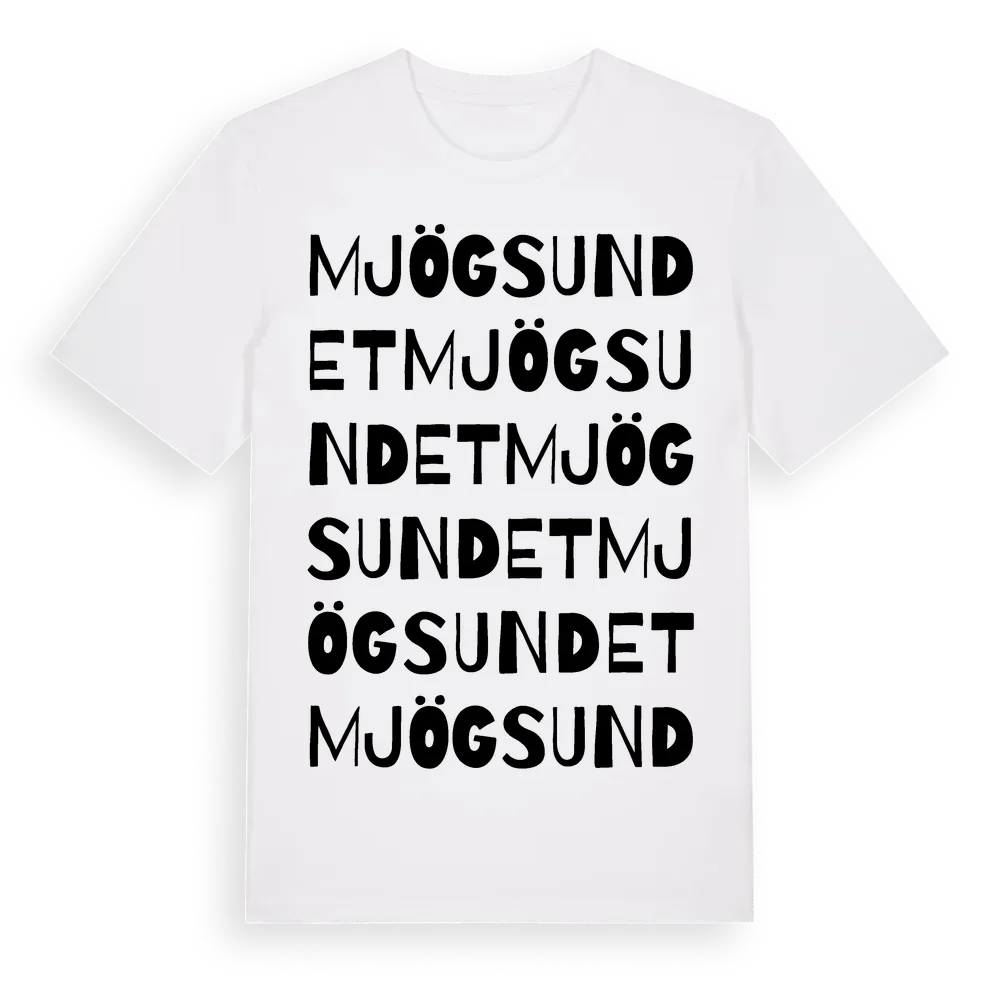 En ordlek byggd på Mjögsundets namn. Subtilt och klurig – ett motiv som bara de som verkligen känner platsen fullt ut förstår. Premium bomull, unisex – från Mjögsundet i Dalarnas län.