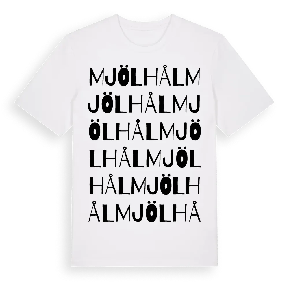 Mjölhål ordlek t-shirt är inspirerad av Mjölhål i Dalarnas län, Sverige. Tröjan är designad för dig som har en speciell koppling till platsen – oavsett om du bor här, har rötterna här eller bara älskar Mjölhål.