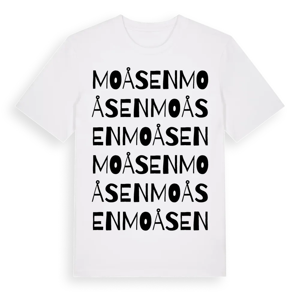 Moåsen ordlek t-shirt är inspirerad av byn Moåsen i Dalarnas län, Sverige. Tröjan är designad för dig som har en speciell koppling till platsen – oavsett om du bor här, har rötterna här eller bara älskar Moåsen.