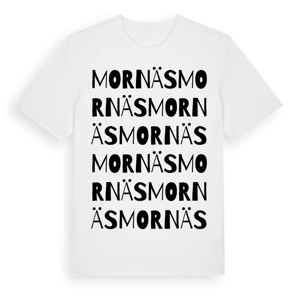 En ordlek byggd på Mornäss namn. Subtilt och klurig – ett motiv som bara de som verkligen känner platsen fullt ut förstår. Premium bomull, unisex – från byn Mornäs i Dalarnas län.