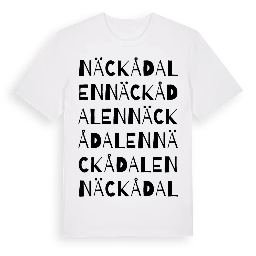 Näckådalen ordlek t-shirt är inspirerad av byn Näckådalen i Dalarnas län, Sverige. Tröjan är designad för dig som har en speciell koppling till platsen – oavsett om du bor här, har rötterna här eller bara älskar Näckådalen.