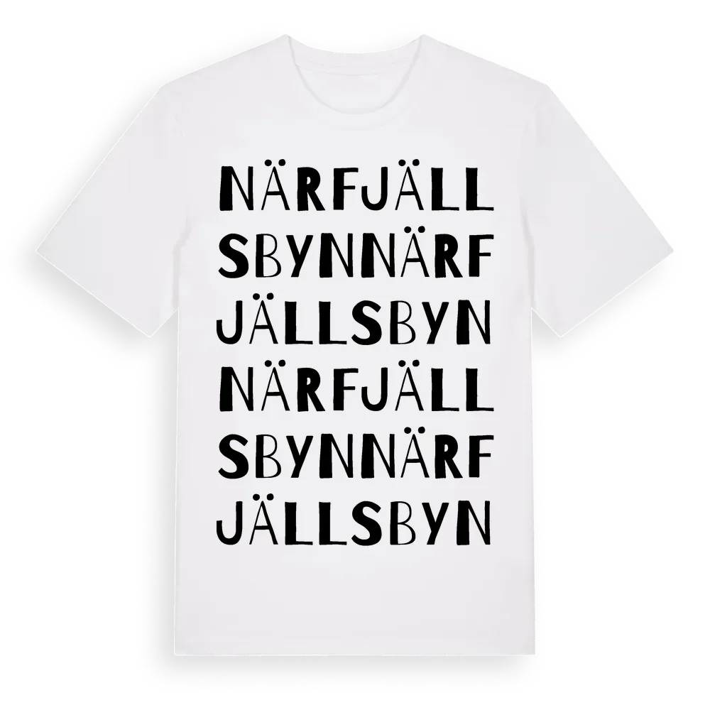Närfjällsbyn ordlek t-shirt är inspirerad av byn Närfjällsbyn i Dalarnas län, Sverige. Tröjan är designad för dig som har en speciell koppling till platsen – oavsett om du bor här, har rötterna här eller bara älskar Närfjällsbyn.