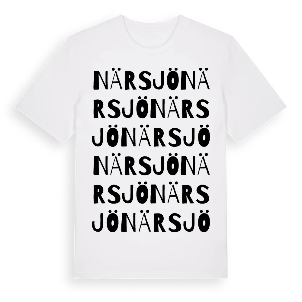 Närsjö ordlek t-shirt är inspirerad av byn Närsjö i Dalarnas län, Sverige. Tröjan är designad för dig som har en speciell koppling till platsen – oavsett om du bor här, har rötterna här eller bara älskar Närsjö.