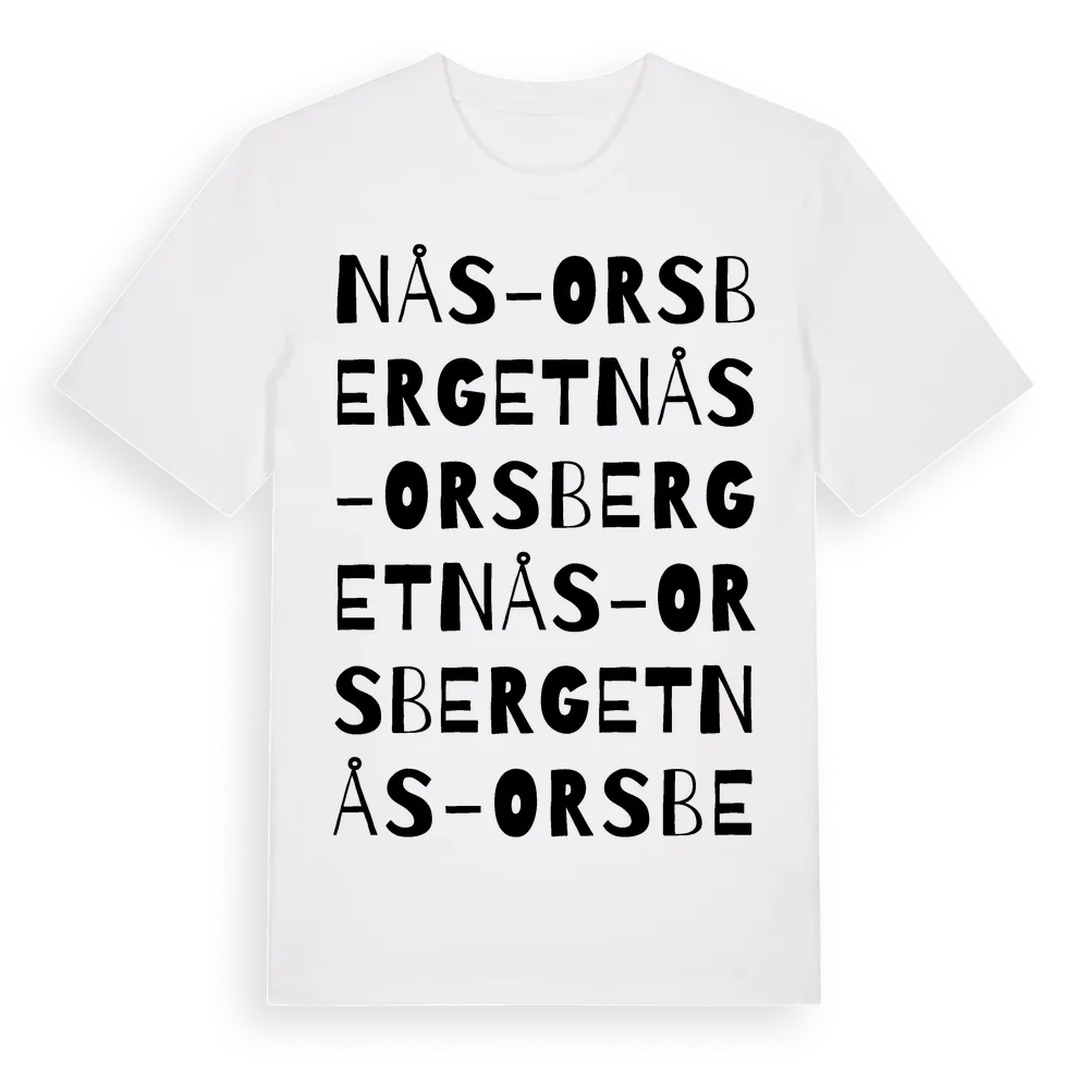 Nås-Orsberget ordlek t-shirt är inspirerad av Nås-Orsberget i Dalarnas län, Sverige. Tröjan är designad för dig som har en speciell koppling till platsen – oavsett om du bor här, har rötterna här eller bara älskar Nås-Orsberget.
