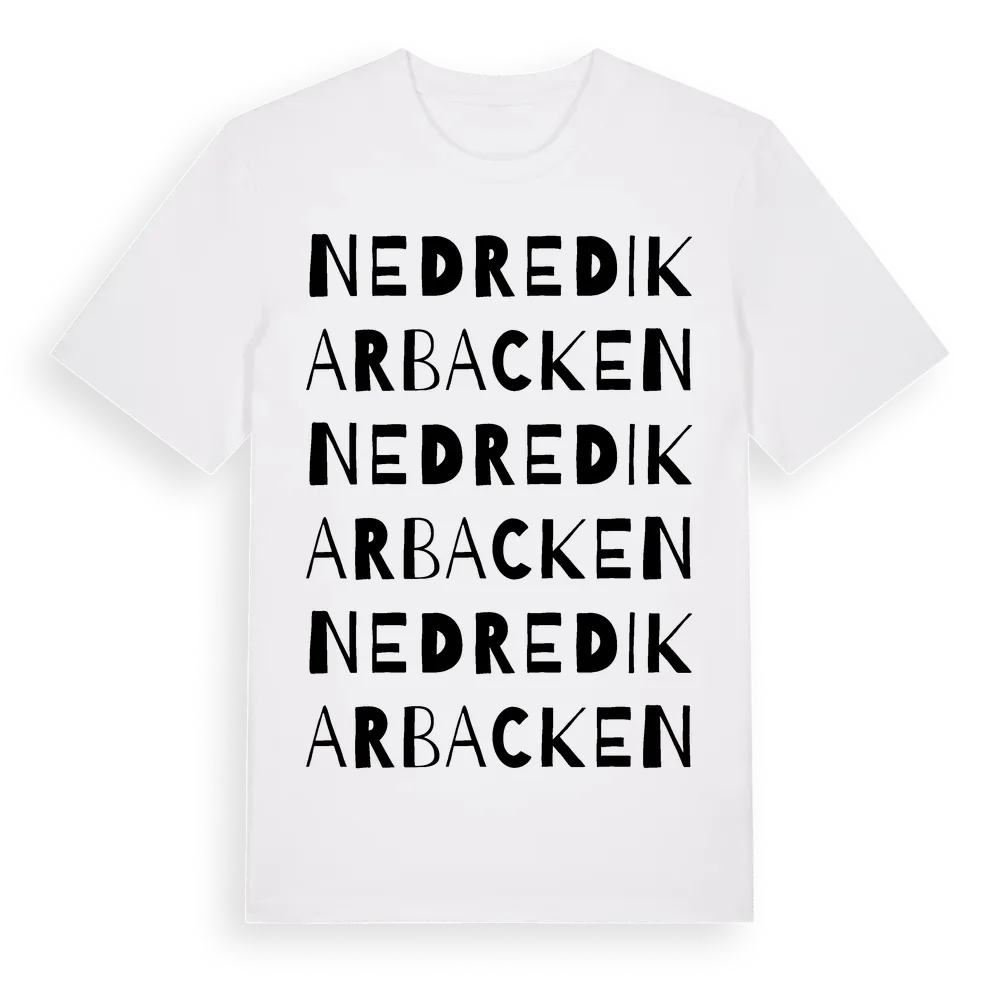 Nedre Dikarbacken ordlek t-shirt är inspirerad av byn Nedre Dikarbacken i Dalarnas län, Sverige. Tröjan är designad för dig som har en speciell koppling till platsen – oavsett om du bor här, har rötterna här eller bara älskar Nedre Dikarbacken.