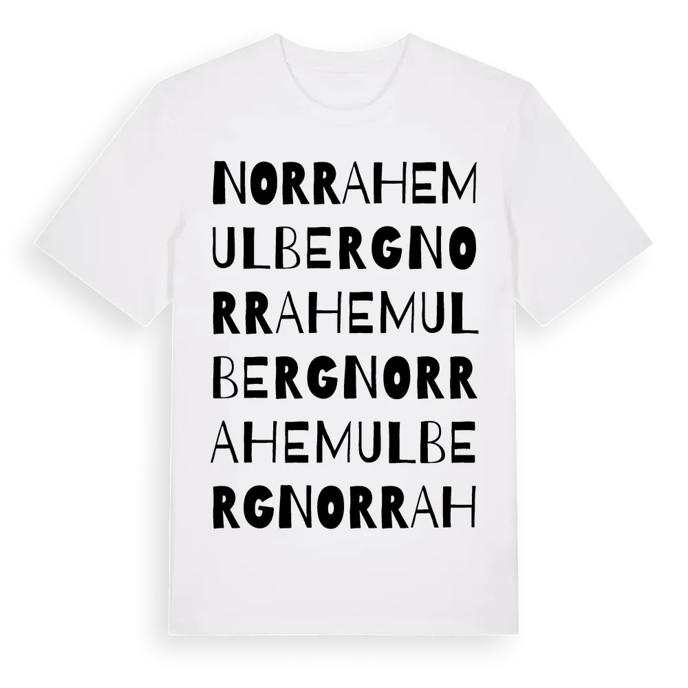 Norra Hemulberg ordlek t-shirt är inspirerad av Norra Hemulberg i Dalarnas län, Sverige. Tröjan är designad för dig som har en speciell koppling till platsen – oavsett om du bor här, har rötterna här eller bara älskar Norra Hemulberg.