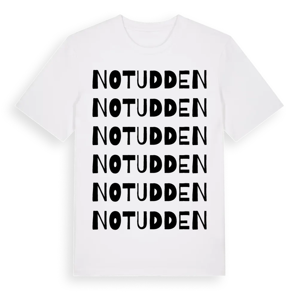 En ordlek byggd på Notuddens namn. Subtilt och klurig – ett motiv som bara de som verkligen känner platsen fullt ut förstår. Premium bomull, unisex – från byn Notudden i Dalarnas län.