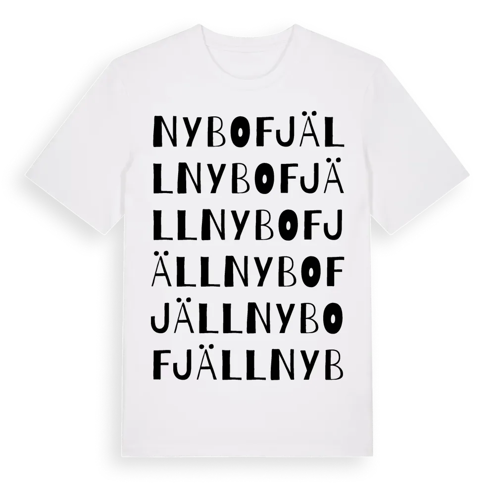 Nybofjäll ordlek t-shirt är inspirerad av byn Nybofjäll i Dalarnas län, Sverige. Tröjan är designad för dig som har en speciell koppling till platsen – oavsett om du bor här, har rötterna här eller bara älskar Nybofjäll.