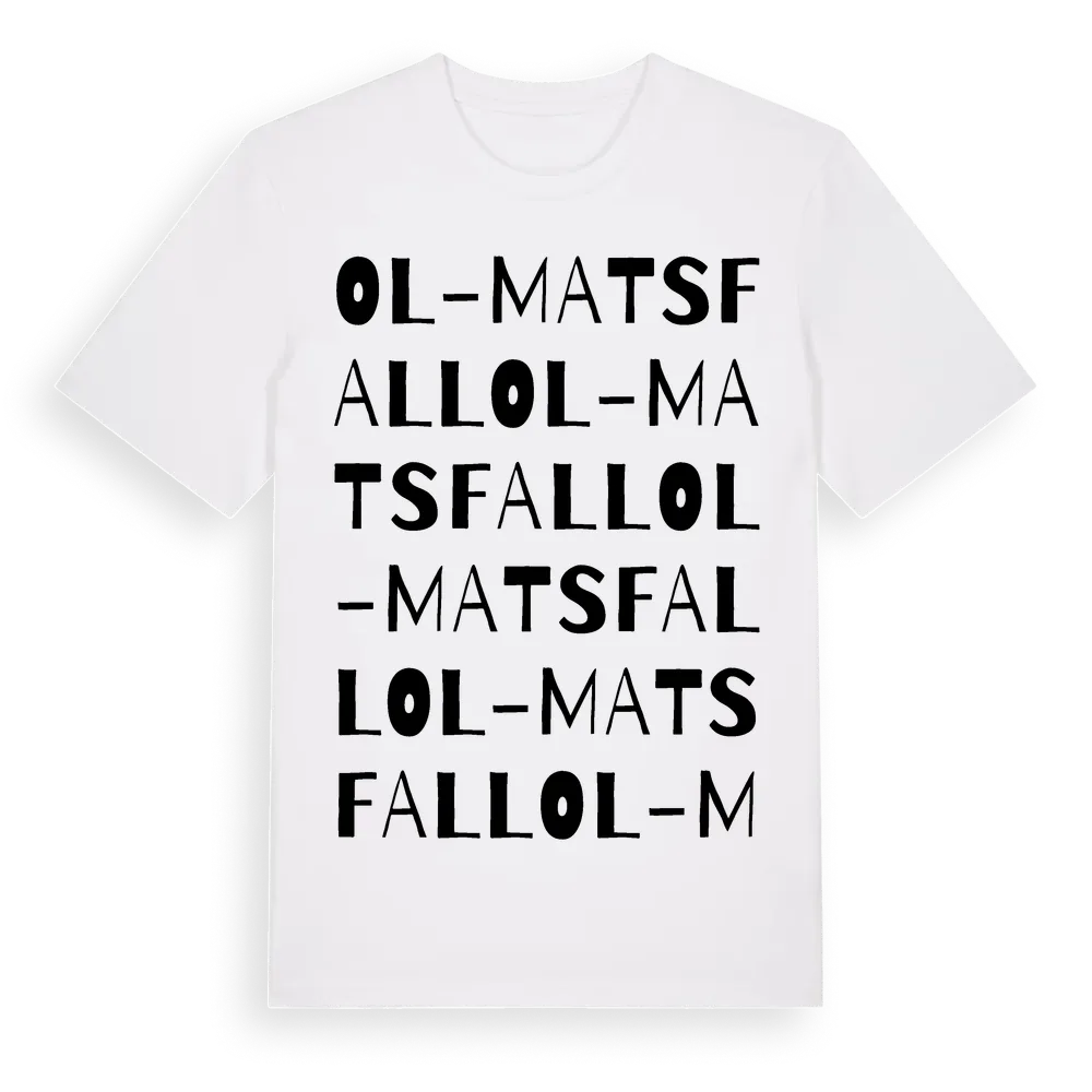 Ol-Matsfall ordlek t-shirt är inspirerad av Ol-Matsfall i Dalarnas län, Sverige. Tröjan är designad för dig som har en speciell koppling till platsen – oavsett om du bor här, har rötterna här eller bara älskar Ol-Matsfall.