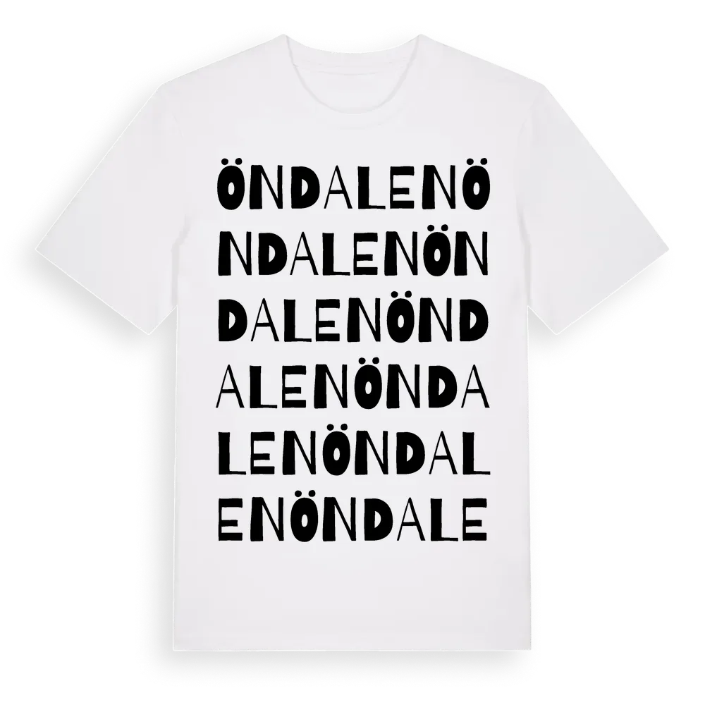 Öndalen ordlek t-shirt är inspirerad av byn Öndalen i Dalarnas län, Sverige. Tröjan är designad för dig som har en speciell koppling till platsen – oavsett om du bor här, har rötterna här eller bara älskar Öndalen.