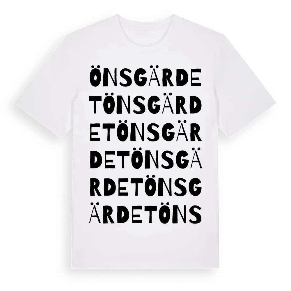 Önsgärdet ordlek t-shirt är inspirerad av byn Önsgärdet i Dalarnas län, Sverige. Tröjan är designad för dig som har en speciell koppling till platsen – oavsett om du bor här, har rötterna här eller bara älskar Önsgärdet.