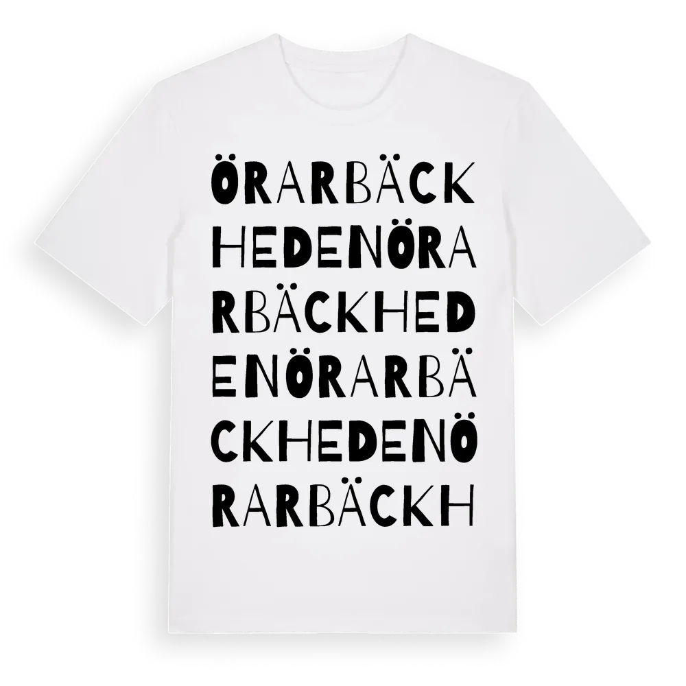 Örarbäckheden ordlek t-shirt är inspirerad av Örarbäckheden i Dalarnas län, Sverige. Tröjan är designad för dig som har en speciell koppling till platsen – oavsett om du bor här, har rötterna här eller bara älskar Örarbäckheden.