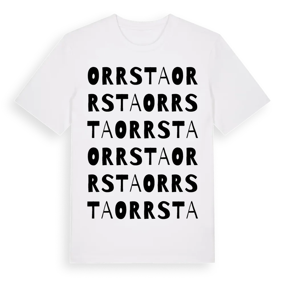 Orrsta ordlek t-shirt är inspirerad av byn Orrsta i Dalarnas län, Sverige. Tröjan är designad för dig som har en speciell koppling till platsen – oavsett om du bor här, har rötterna här eller bara älskar Orrsta.