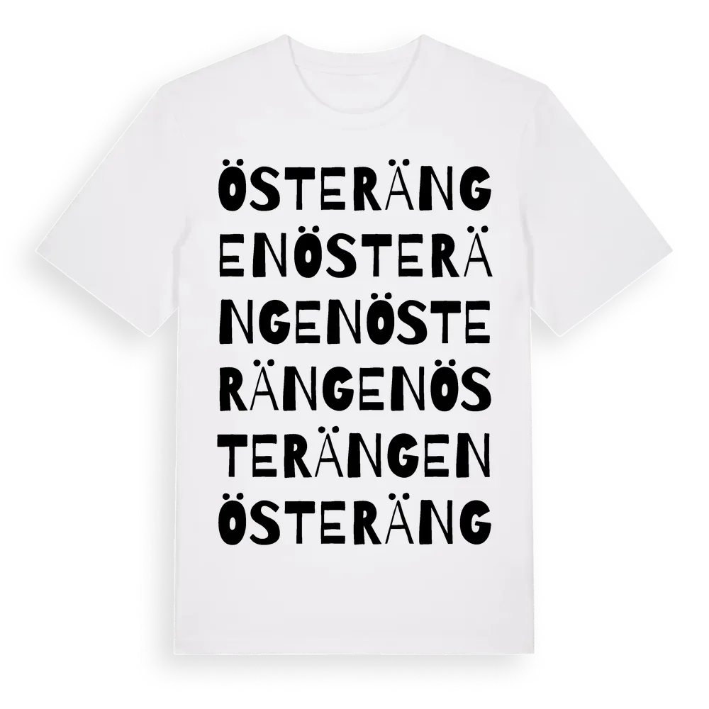 Österängen ordlek t-shirt är inspirerad av byn Österängen i Dalarnas län, Sverige. Tröjan är designad för dig som har en speciell koppling till platsen – oavsett om du bor här, har rötterna här eller bara älskar Österängen.