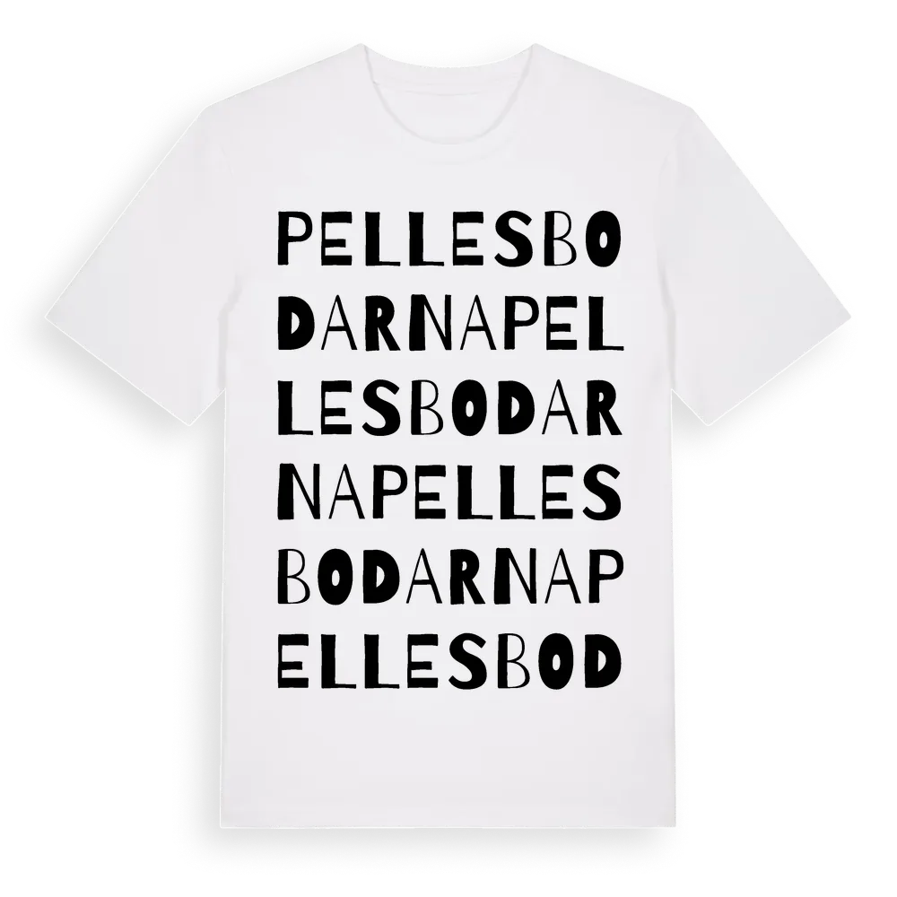 Pellesbodarna ordlek t-shirt är inspirerad av Pellesbodarna i Dalarnas län, Sverige. Tröjan är designad för dig som har en speciell koppling till platsen – oavsett om du bor här, har rötterna här eller bara älskar Pellesbodarna.