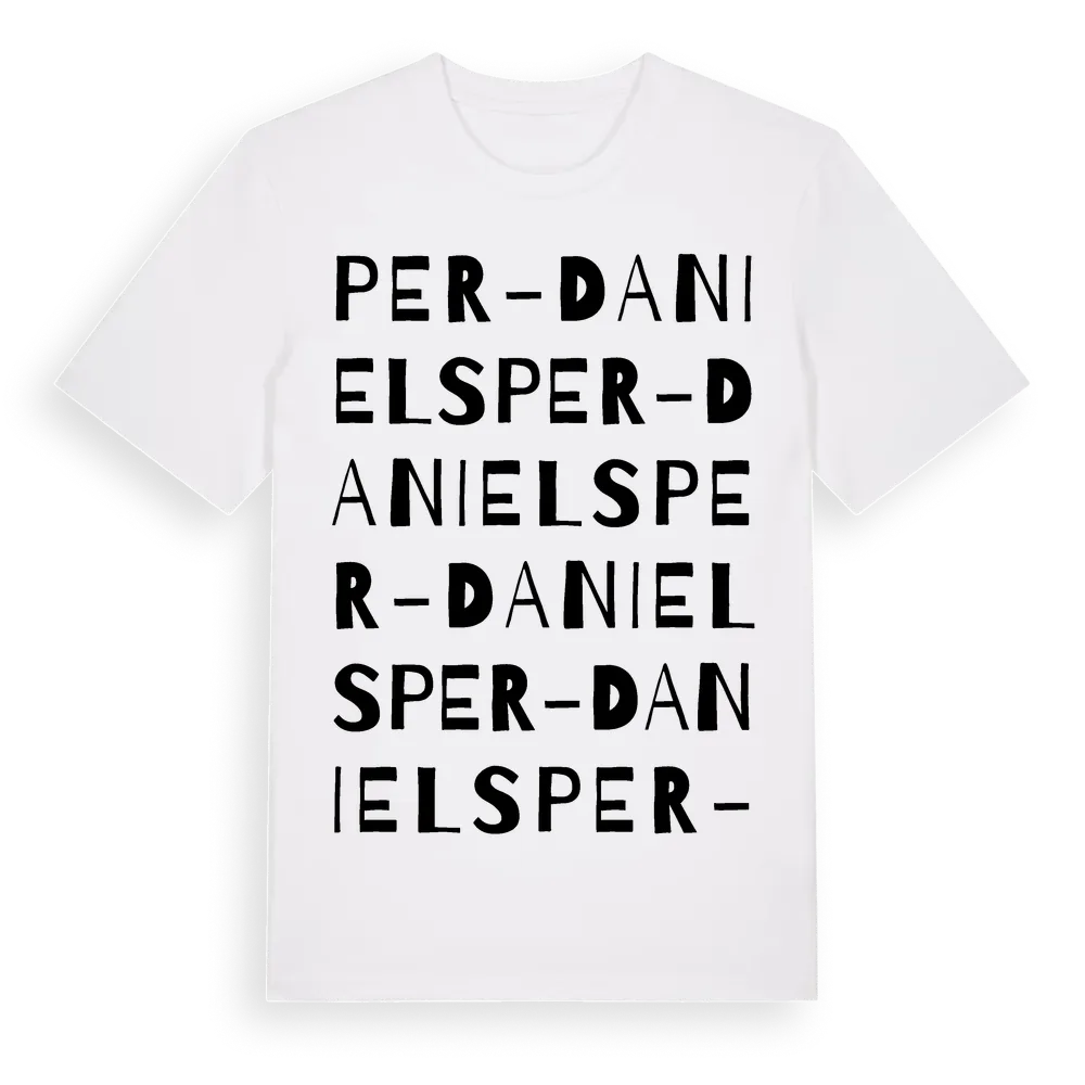 Per-Daniels ordlek t-shirt är inspirerad av Per-Daniels i Dalarnas län, Sverige. Tröjan är designad för dig som har en speciell koppling till platsen – oavsett om du bor här, har rötterna här eller bara älskar Per-Daniels.