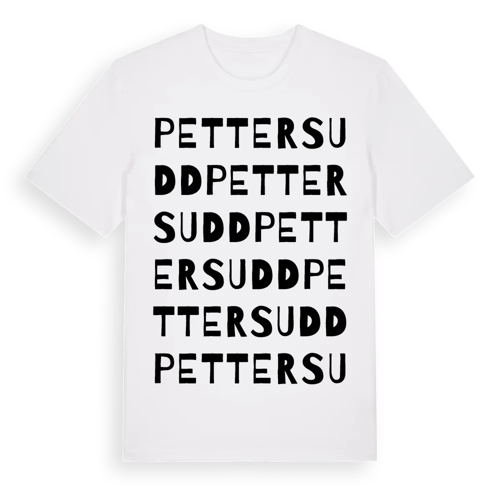 Petters Udd ordlek t-shirt är inspirerad av Petters Udd i Dalarnas län, Sverige. Tröjan är designad för dig som har en speciell koppling till platsen – oavsett om du bor här, har rötterna här eller bara älskar Petters Udd.