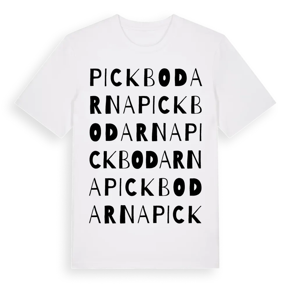 Pickbodarna ordlek t-shirt är inspirerad av Pickbodarna i Dalarnas län, Sverige. Tröjan är designad för dig som har en speciell koppling till platsen – oavsett om du bor här, har rötterna här eller bara älskar Pickbodarna.