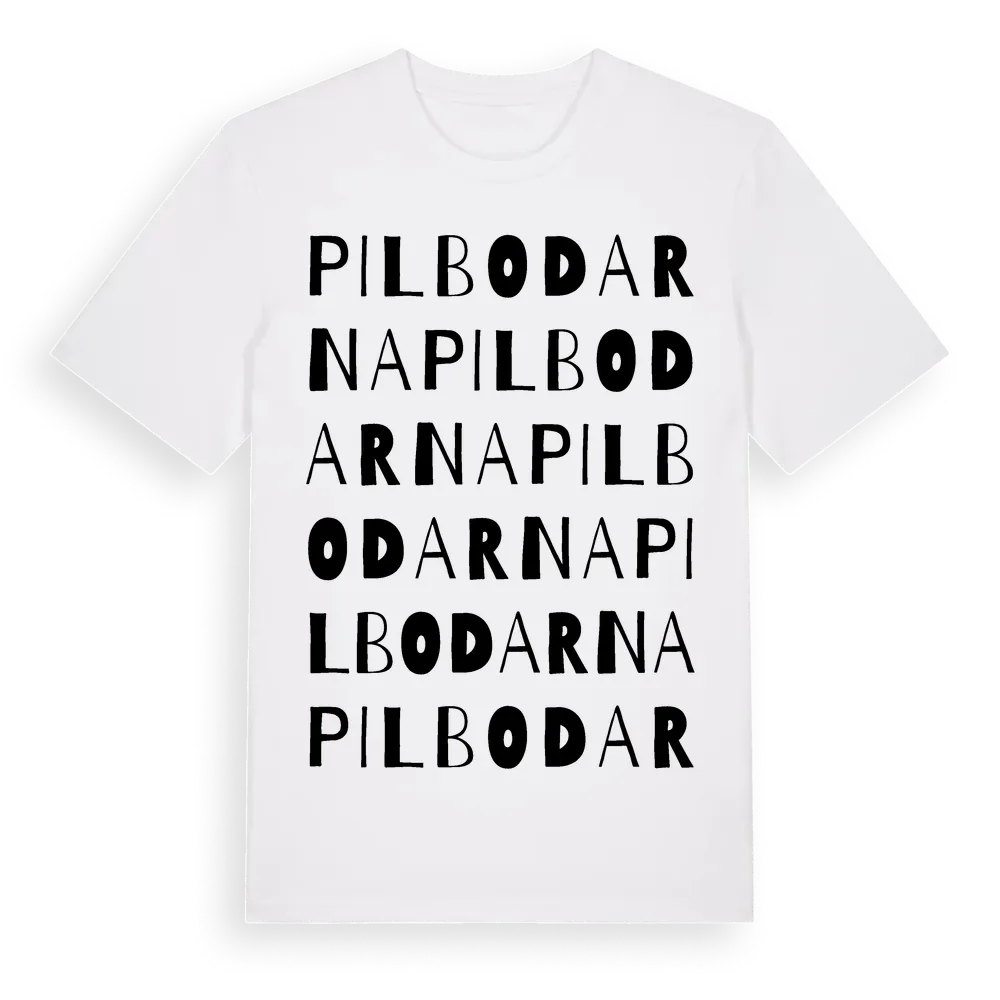 Pilbodarna ordlek t-shirt är inspirerad av Pilbodarna i Dalarnas län, Sverige. Tröjan är designad för dig som har en speciell koppling till platsen – oavsett om du bor här, har rötterna här eller bara älskar Pilbodarna.