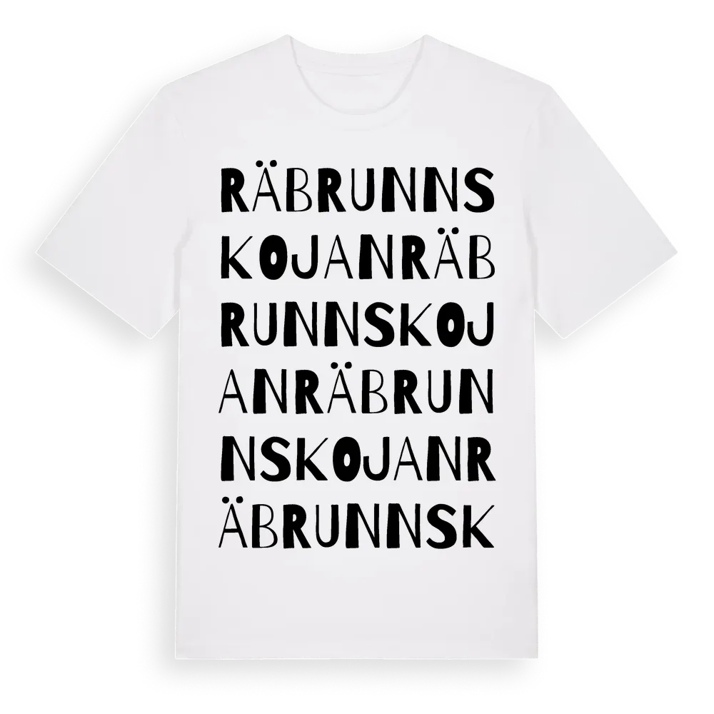Räbrunnskojan ordlek t-shirt är inspirerad av Räbrunnskojan i Dalarnas län, Sverige. Tröjan är designad för dig som har en speciell koppling till platsen – oavsett om du bor här, har rötterna här eller bara älskar Räbrunnskojan.