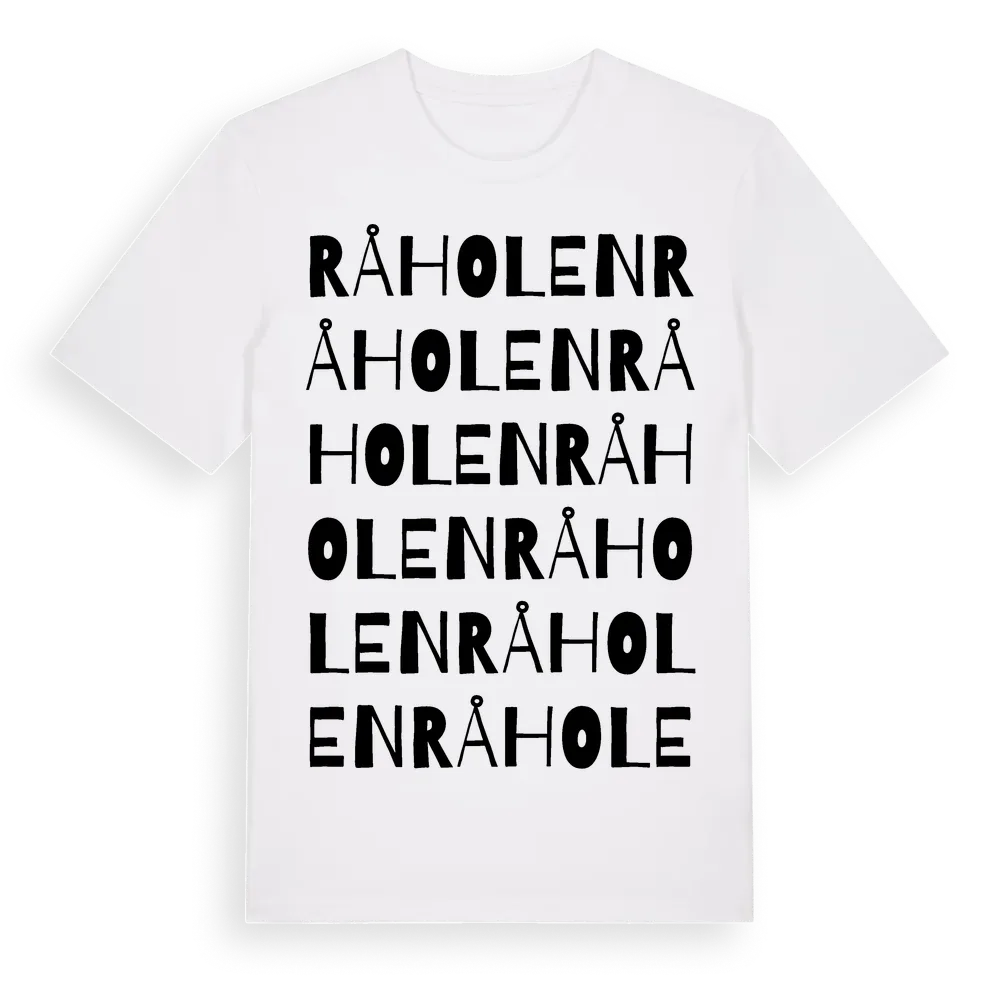 En ordlek byggd på Råholens namn. Subtilt och klurig – ett motiv som bara de som verkligen känner platsen fullt ut förstår. Premium bomull, unisex – från byn Råholen i Dalarnas län.