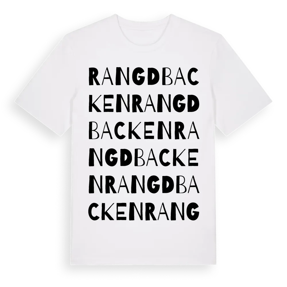 Rangdbacken ordlek t-shirt är inspirerad av byn Rangdbacken i Dalarnas län, Sverige. Tröjan är designad för dig som har en speciell koppling till platsen – oavsett om du bor här, har rötterna här eller bara älskar Rangdbacken.