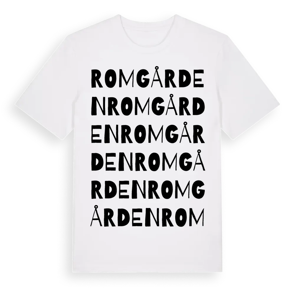 Romgården ordlek t-shirt är inspirerad av Romgården i Dalarnas län, Sverige. Tröjan är designad för dig som har en speciell koppling till platsen – oavsett om du bor här, har rötterna här eller bara älskar Romgården.