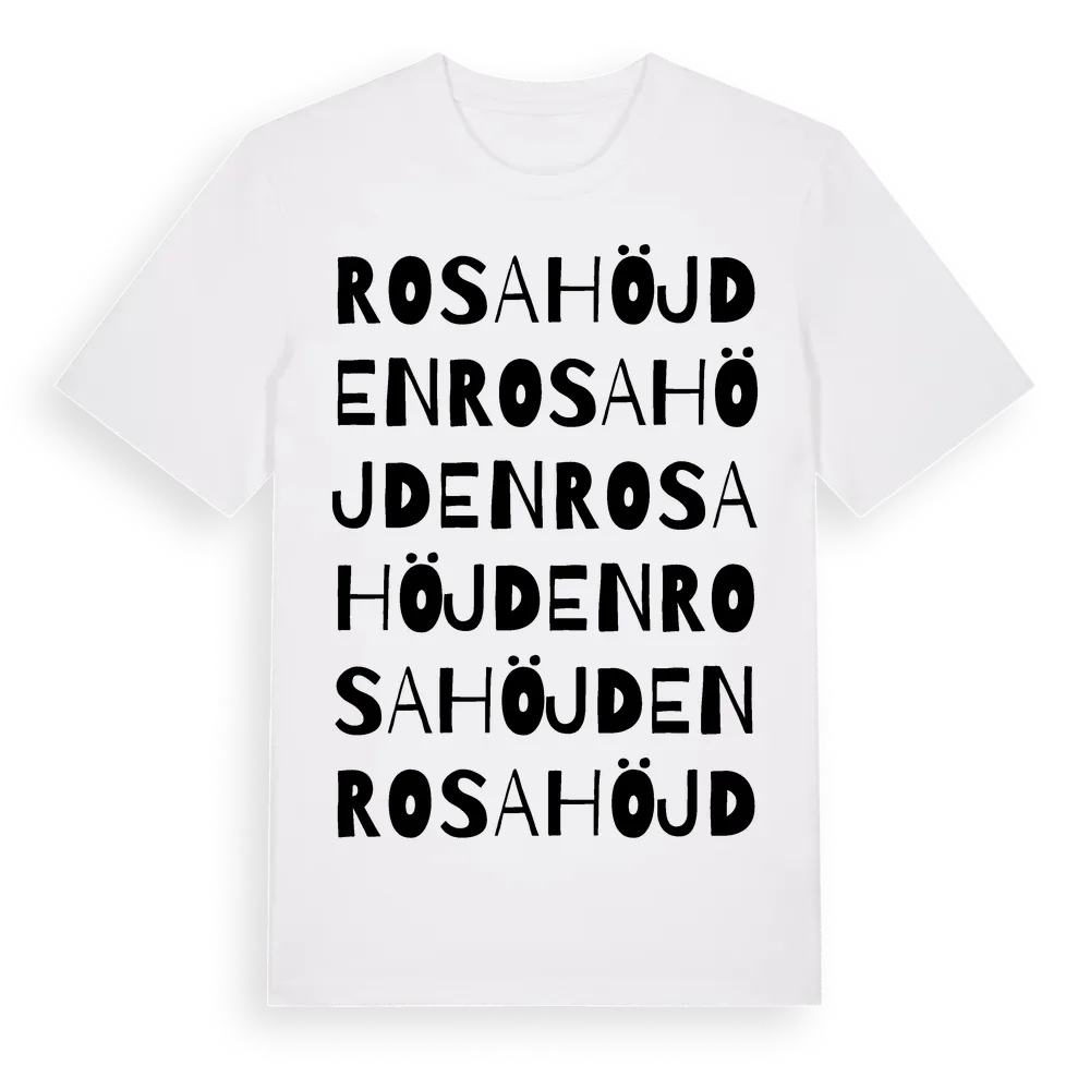 Rosahöjden ordlek t-shirt är inspirerad av Rosahöjden i Dalarnas län, Sverige. Tröjan är designad för dig som har en speciell koppling till platsen – oavsett om du bor här, har rötterna här eller bara älskar Rosahöjden.