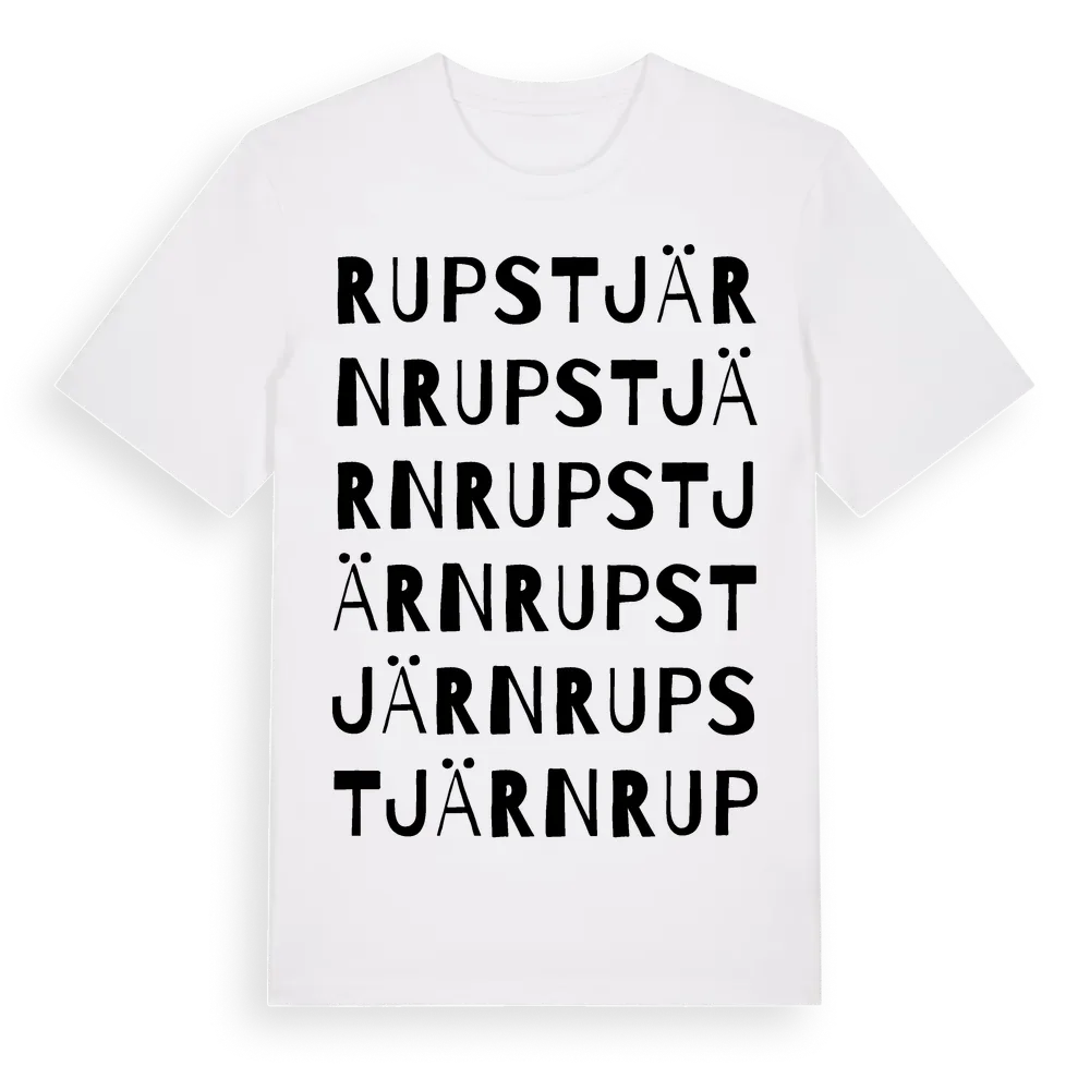 Rupstjärn ordlek t-shirt är inspirerad av byn Rupstjärn i Dalarnas län, Sverige. Tröjan är designad för dig som har en speciell koppling till platsen – oavsett om du bor här, har rötterna här eller bara älskar Rupstjärn.