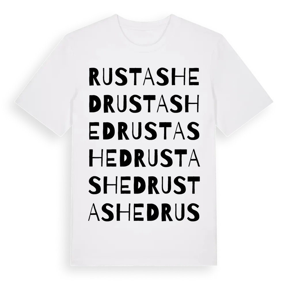 Rustashed ordlek t-shirt är inspirerad av Rustashed i Dalarnas län, Sverige. Tröjan är designad för dig som har en speciell koppling till platsen – oavsett om du bor här, har rötterna här eller bara älskar Rustashed.