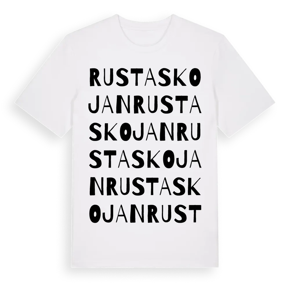 Rustaskojan ordlek t-shirt är inspirerad av Rustaskojan i Dalarnas län, Sverige. Tröjan är designad för dig som har en speciell koppling till platsen – oavsett om du bor här, har rötterna här eller bara älskar Rustaskojan.