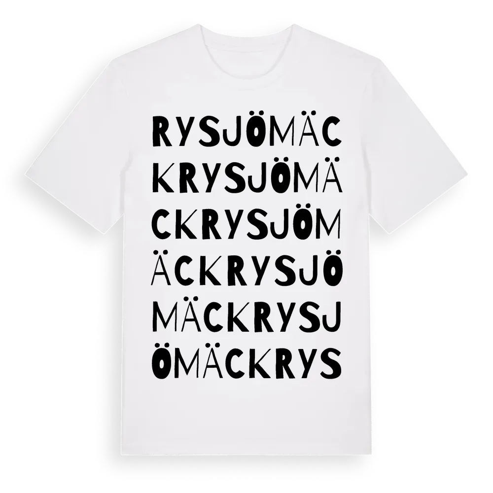 Rysjömäck ordlek t-shirt är inspirerad av byn Rysjömäck i Dalarnas län, Sverige. Tröjan är designad för dig som har en speciell koppling till platsen – oavsett om du bor här, har rötterna här eller bara älskar Rysjömäck.