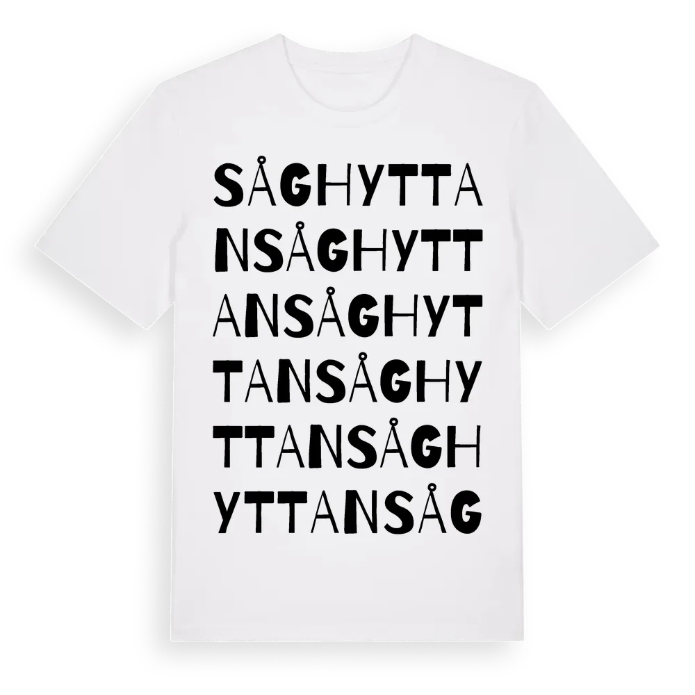 Såghyttan ordlek t-shirt är inspirerad av Såghyttan i Dalarnas län, Sverige. Tröjan är designad för dig som har en speciell koppling till platsen – oavsett om du bor här, har rötterna här eller bara älskar Såghyttan.