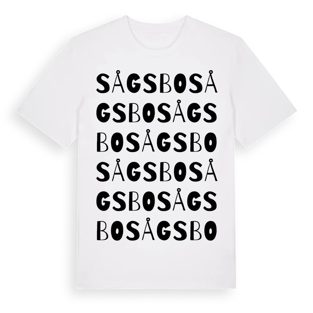 Sågsbo ordlek t-shirt är inspirerad av byn Sågsbo i Dalarnas län, Sverige. Tröjan är designad för dig som har en speciell koppling till platsen – oavsett om du bor här, har rötterna här eller bara älskar Sågsbo.