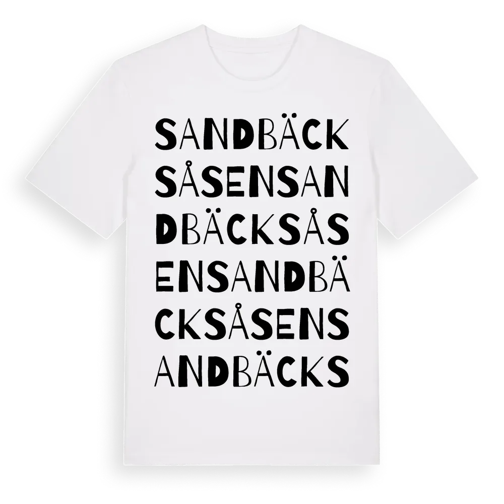 Sandbäcksåsen ordlek t-shirt är inspirerad av Sandbäcksåsen i Dalarnas län, Sverige. Tröjan är designad för dig som har en speciell koppling till platsen – oavsett om du bor här, har rötterna här eller bara älskar Sandbäcksåsen.
