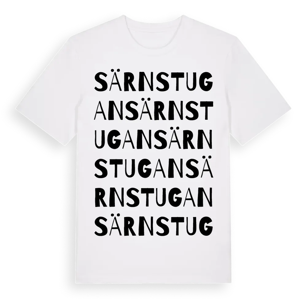 Särnstugan ordlek t-shirt är inspirerad av byn Särnstugan i Dalarnas län, Sverige. Tröjan är designad för dig som har en speciell koppling till platsen – oavsett om du bor här, har rötterna här eller bara älskar Särnstugan.