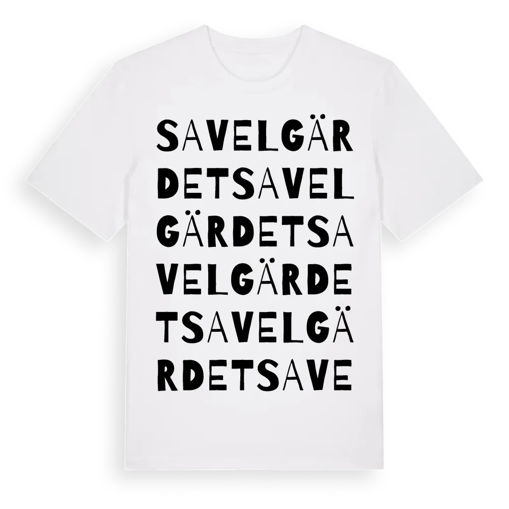 Savelgärdet ordlek t-shirt är inspirerad av Savelgärdet i Dalarnas län, Sverige. Tröjan är designad för dig som har en speciell koppling till platsen – oavsett om du bor här, har rötterna här eller bara älskar Savelgärdet.