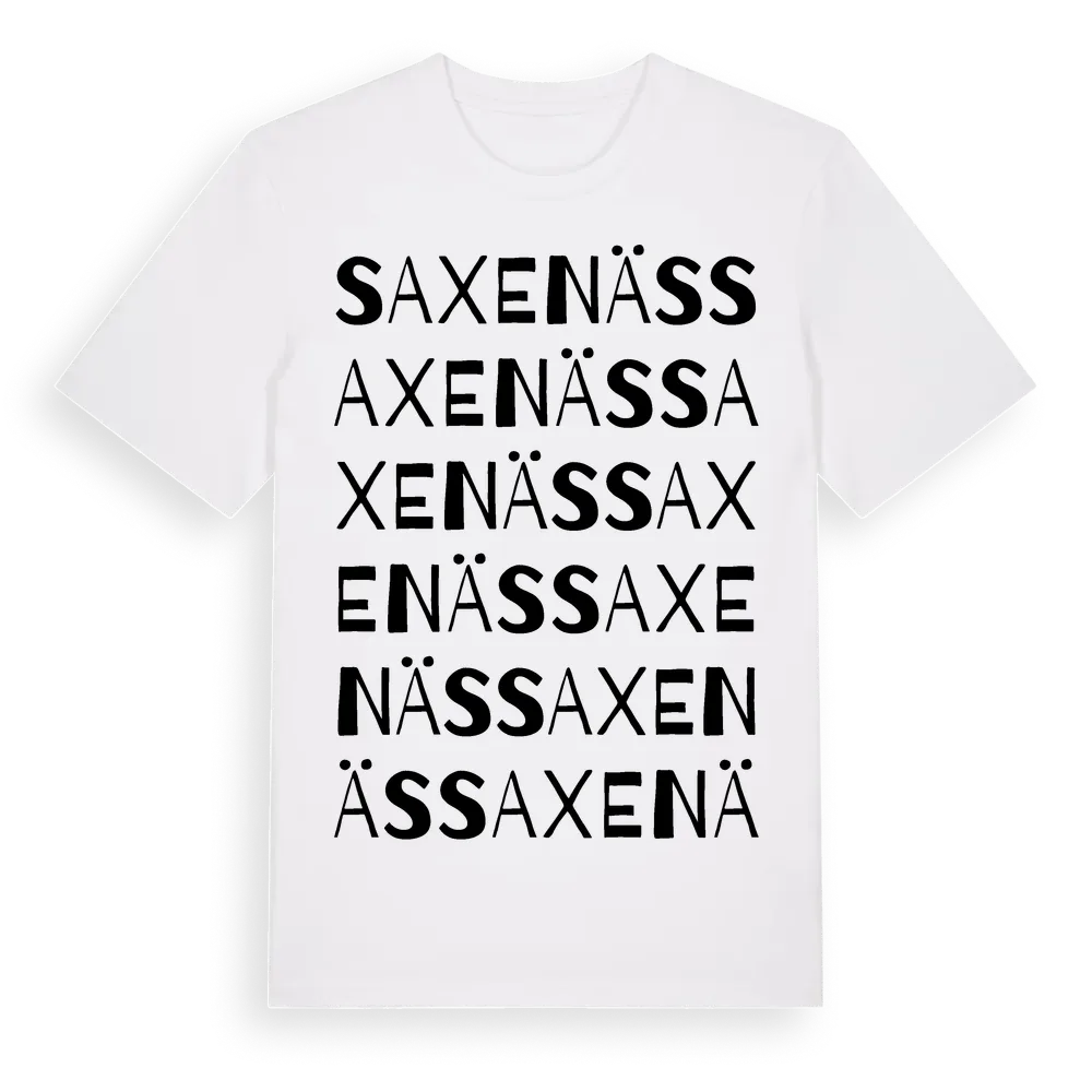En ordlek byggd på Saxenäss namn. Subtilt och klurig – ett motiv som bara de som verkligen känner platsen fullt ut förstår. Premium bomull, unisex – från byn Saxenäs i Dalarnas län.
