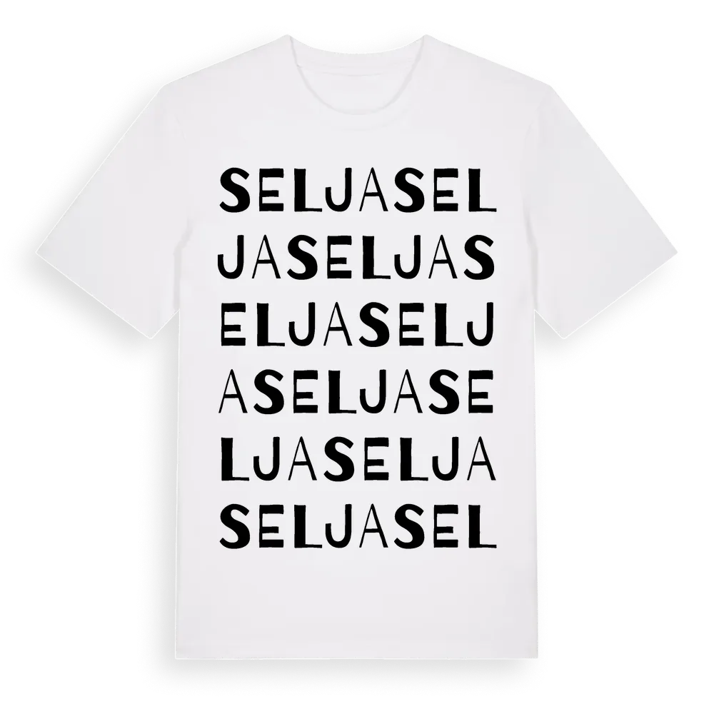 Selja ordlek t-shirt är inspirerad av byn Selja i Dalarnas län, Sverige. Tröjan är designad för dig som har en speciell koppling till platsen – oavsett om du bor här, har rötterna här eller bara älskar Selja.