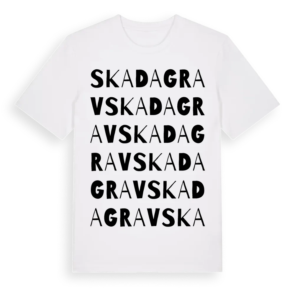 Skadagrav ordlek t-shirt är inspirerad av Skadagrav i Dalarnas län, Sverige. Tröjan är designad för dig som har en speciell koppling till platsen – oavsett om du bor här, har rötterna här eller bara älskar Skadagrav.