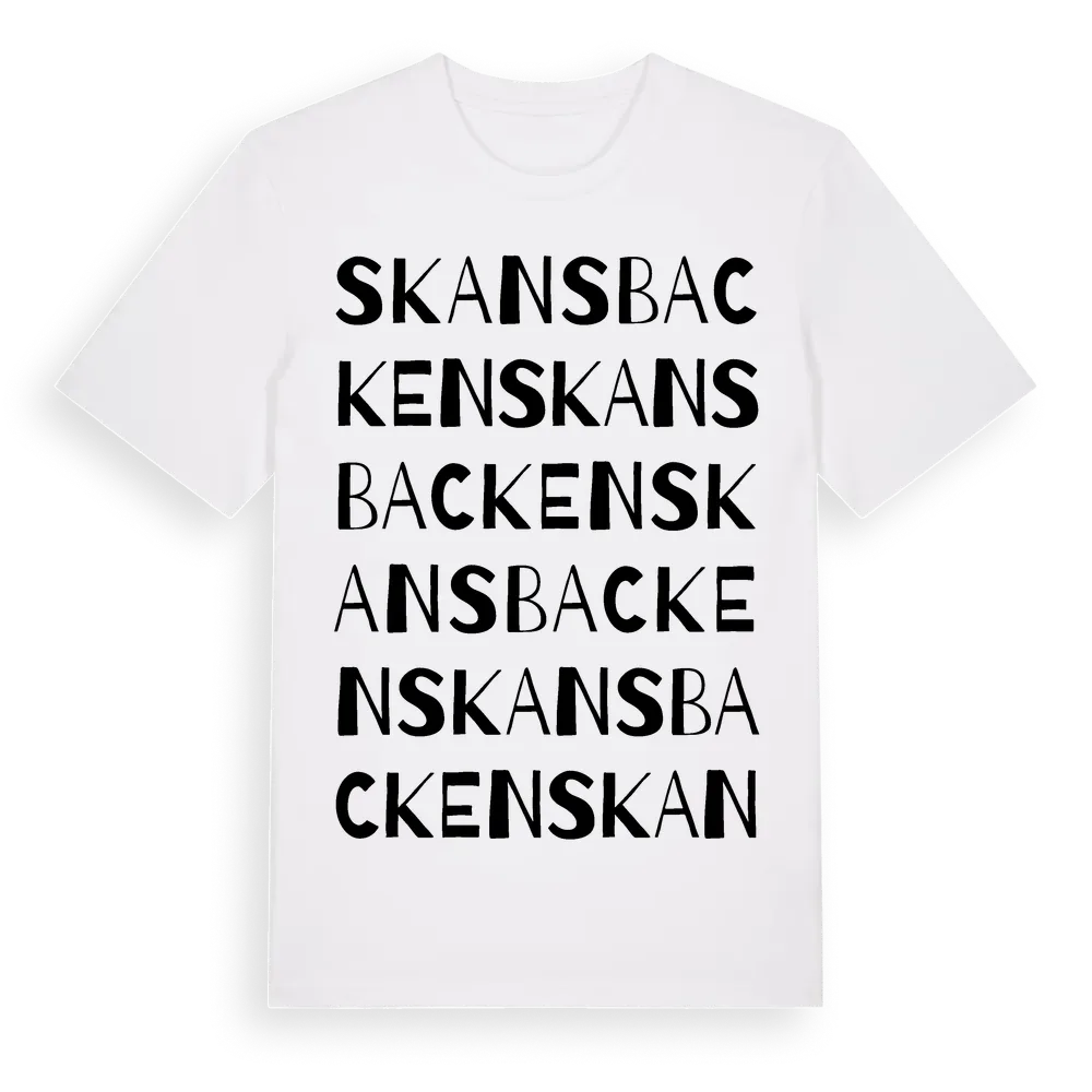 Skansbacken ordlek t-shirt är inspirerad av byn Skansbacken i Dalarnas län, Sverige. Tröjan är designad för dig som har en speciell koppling till platsen – oavsett om du bor här, har rötterna här eller bara älskar Skansbacken.