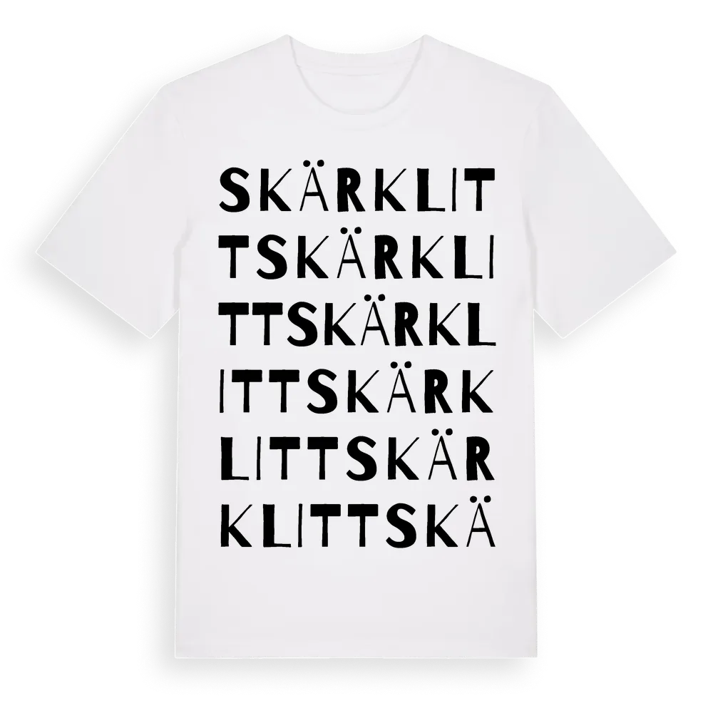Skärklitt ordlek t-shirt är inspirerad av byn Skärklitt i Dalarnas län, Sverige. Tröjan är designad för dig som har en speciell koppling till platsen – oavsett om du bor här, har rötterna här eller bara älskar Skärklitt.