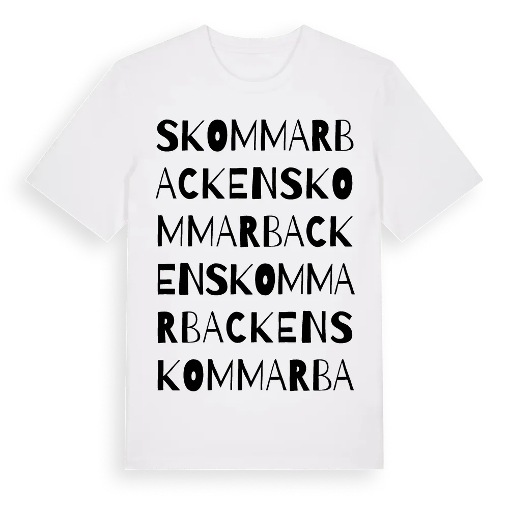 Skommarbacken ordlek t-shirt är inspirerad av Skommarbacken i Dalarnas län, Sverige. Tröjan är designad för dig som har en speciell koppling till platsen – oavsett om du bor här, har rötterna här eller bara älskar Skommarbacken.