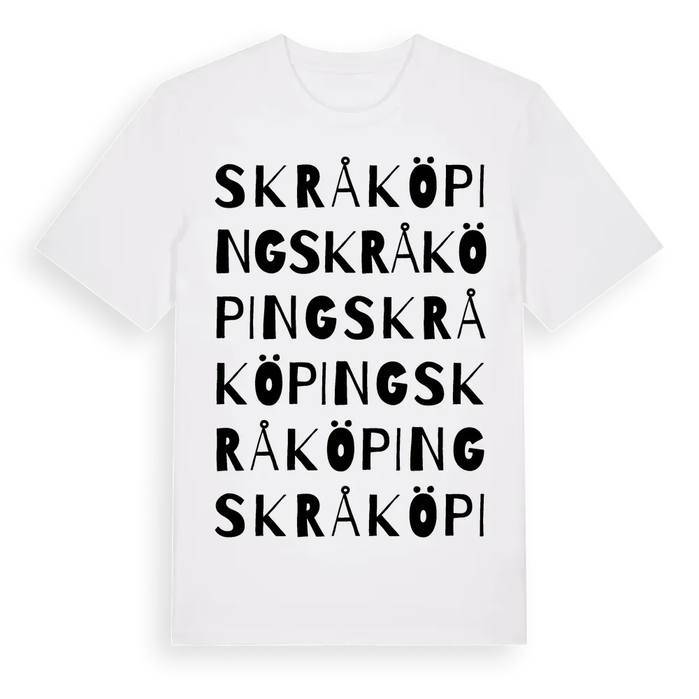 Skråköping ordlek t-shirt är inspirerad av byn Skråköping i Dalarnas län, Sverige. Tröjan är designad för dig som har en speciell koppling till platsen – oavsett om du bor här, har rötterna här eller bara älskar Skråköping.