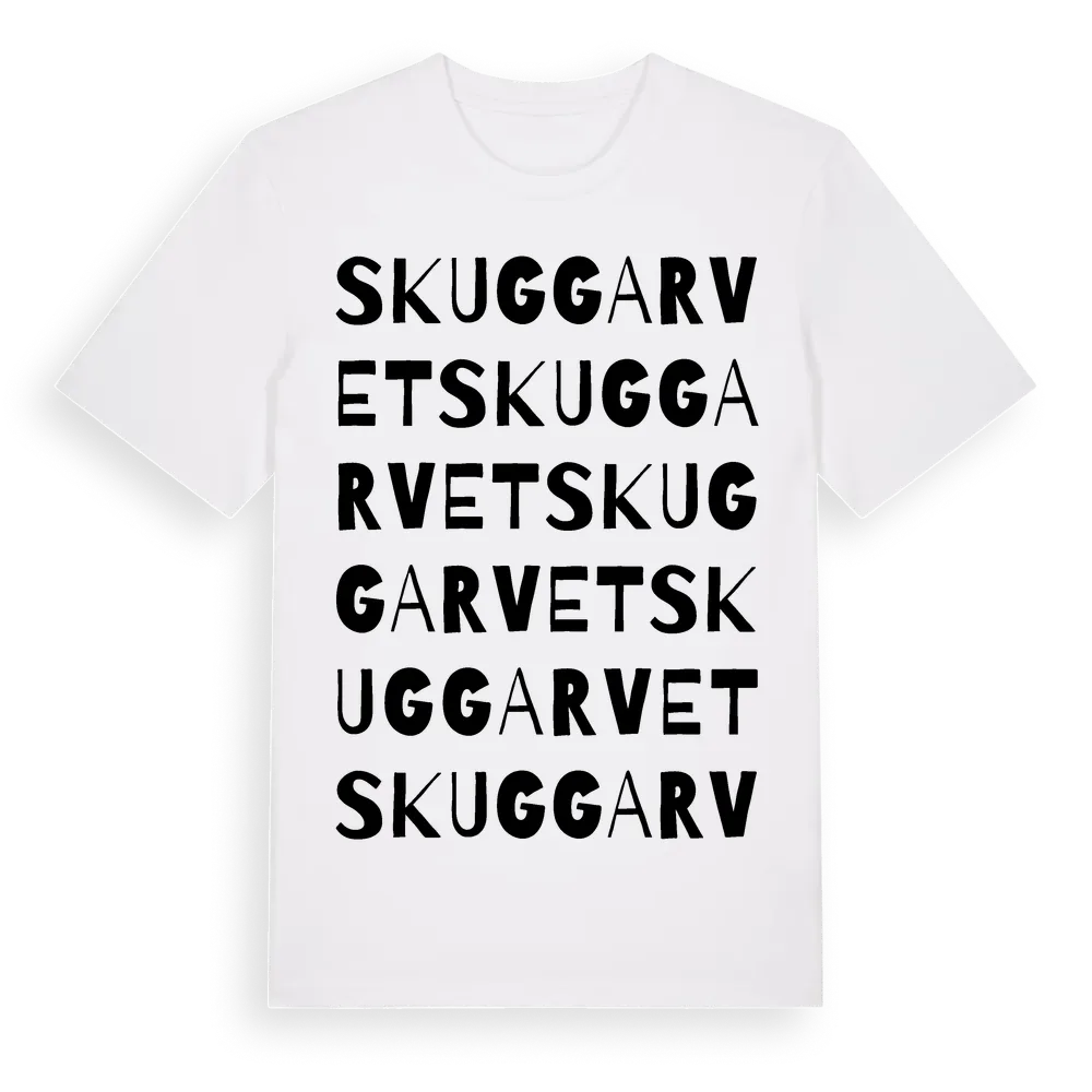 Skuggarvet ordlek t-shirt är inspirerad av byn Skuggarvet i Dalarnas län, Sverige. Tröjan är designad för dig som har en speciell koppling till platsen – oavsett om du bor här, har rötterna här eller bara älskar Skuggarvet.