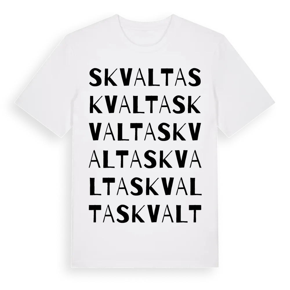 En ordlek byggd på Skvaltas namn. Subtilt och klurig – ett motiv som bara de som verkligen känner platsen fullt ut förstår. Premium bomull, unisex – från Skvalta i Dalarnas län.