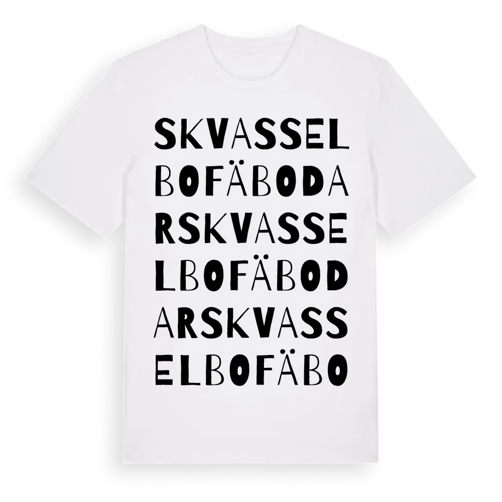 Skvasselbo Fäbodar ordlek t-shirt är inspirerad av Skvasselbo Fäbodar i Dalarnas län, Sverige. Tröjan är designad för dig som har en speciell koppling till platsen – oavsett om du bor här, har rötterna här eller bara älskar Skvasselbo Fäbodar.