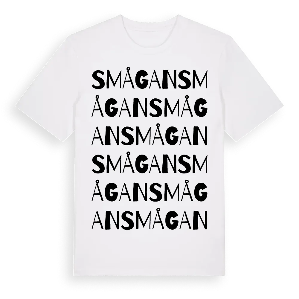 Smågan ordlek t-shirt är inspirerad av byn Smågan i Dalarnas län, Sverige. Tröjan är designad för dig som har en speciell koppling till platsen – oavsett om du bor här, har rötterna här eller bara älskar Smågan.