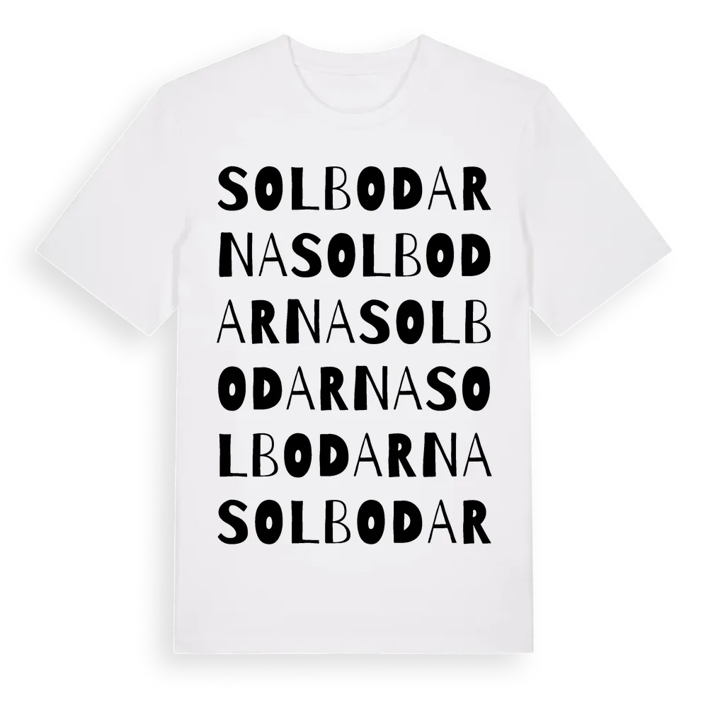 Solbodarna ordlek t-shirt är inspirerad av byn Solbodarna i Dalarnas län, Sverige. Tröjan är designad för dig som har en speciell koppling till platsen – oavsett om du bor här, har rötterna här eller bara älskar Solbodarna.