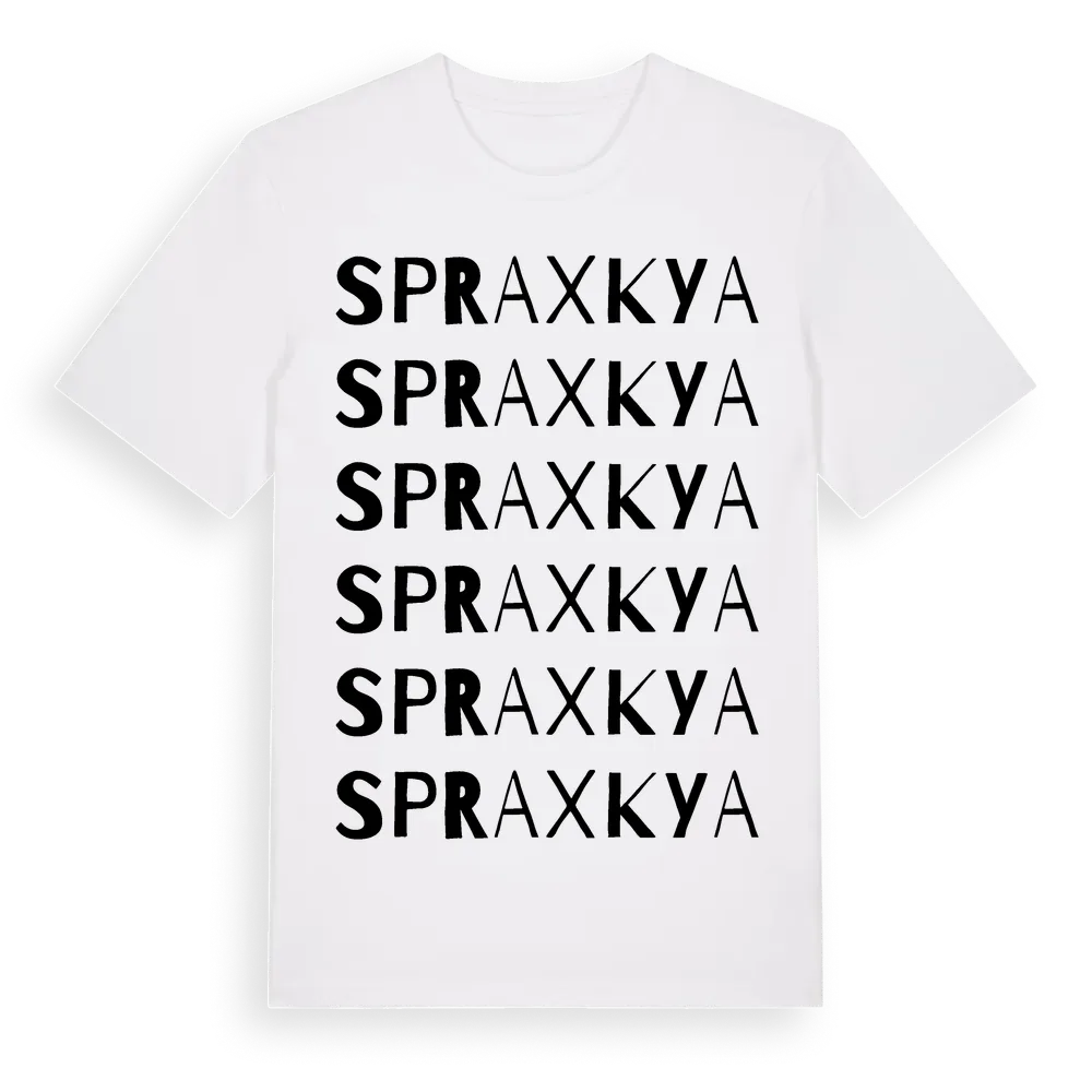 En ordlek byggd på Spraxkyas namn. Subtilt och klurig – ett motiv som bara de som verkligen känner platsen fullt ut förstår. Premium bomull, unisex – från byn Spraxkya i Dalarnas län.